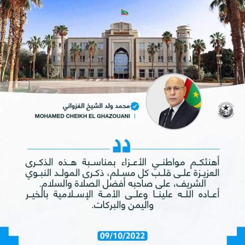 (الإعلام نت): هنأ الرئيس الموريتاني محمد ولد الشيخ الغزواني الشعب الموريتاني بمناسبة ذكرى المولد النبوي الشريف.