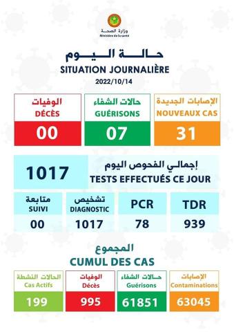 (الإعلام نت): أعلنت وزارة الصحة تسجيل 31 حالة إصابة جدبدة بفيروس كورونا و 07 حالات شفاء دون تسجيل أي حالة وفاة مرتبطة بالفيروس خلال 24 ساعة الأخيرة.