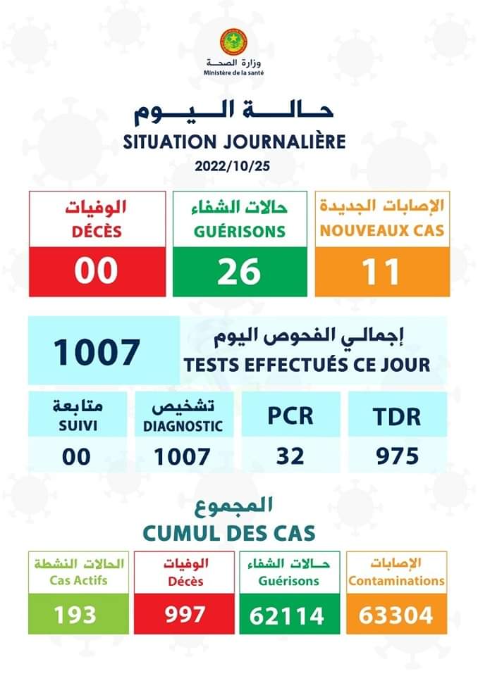 وقالت الوزارة في نشرتها اليومية إنها توصلت للنتيجة بعد إجراء 1007 فحصا منها TDR: 975 و PCR: 32 و 1007 حالة تشخيص