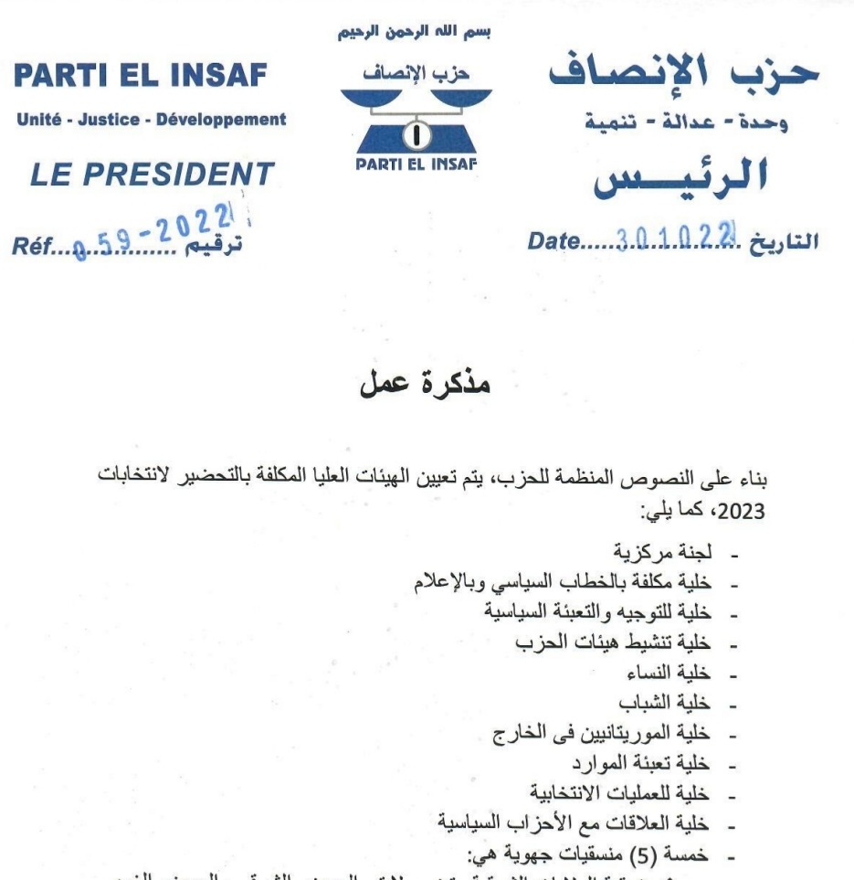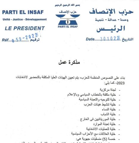 أصدر رئيس الحزب السيد محمد ماء العينين ولد أييه مساء الأحد 30/10/2022 مذكرة تم بموجبها تعيين الهيئات العليا بحزب الإنصاف المكلفة بالتحضير لانتخابات 2023 وجاءت التعيينات على النحو التالي :