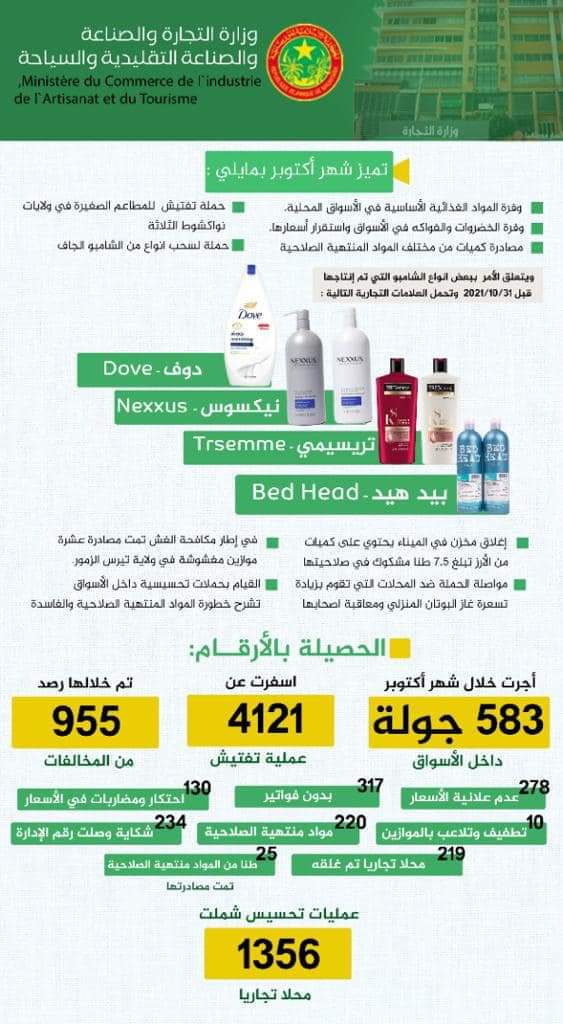 أجرت فرق حماية المستهلك وقمع الغش والمندوبيات الجهوية خلال شهر أكتوبر 583 جولة داخل الأسواق اسفرت عن 4121 عملية تفتيش للمحلات والمجازر والمجمعات التجارية تم خلالها رصد 955 من المخالفات موزعة كما يلي :