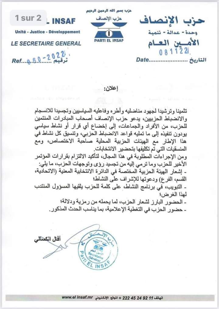(الإعلام نت): طالب حزب الإنصاف الحاكم من أصحاب المبادرات السياسية الوفاعلين السياسيين ب"الانضباط الحزبي وتنسيق أنشطتهم مع المسؤولين الحزبيين في دوائرهم".