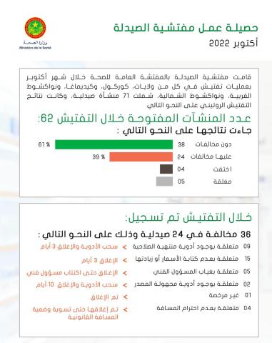 قامت مفتشية الصيدلة بالمفتشة العامة للصحة خلال شهر أكتوبر بعمليات تفتيش في كل من ولايات، كوركول، وكيديماغا، ونواكشوط الغربية، ونواكشوط الشمالية، شملت 71 منشأة صيدلية، وكانت نتائج التفتيش الروتيني على النحو التالي: