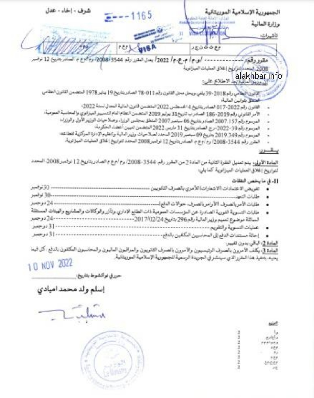 جاء ذلك في مقرر وقعه الوزير إسلم ولد محمد امبادي اليوم الخميس عدد المقرر رقم: 3544 – 2008، الصادر بتاريخ: 12 نوفمبر 2008 المحدد لتواريخ إغلاق العمليات الميزانوية.