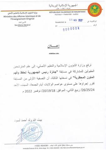 (الإعلام نت): أعلنت وزارة الشؤون الإسلامية والتعليم الأصلي اليوم موعد التصفية الأولى للنسخة الثالثة من مسابقة "جائزة رئيس الجمهورية لحفظ وفهم المتون المحظرية".
