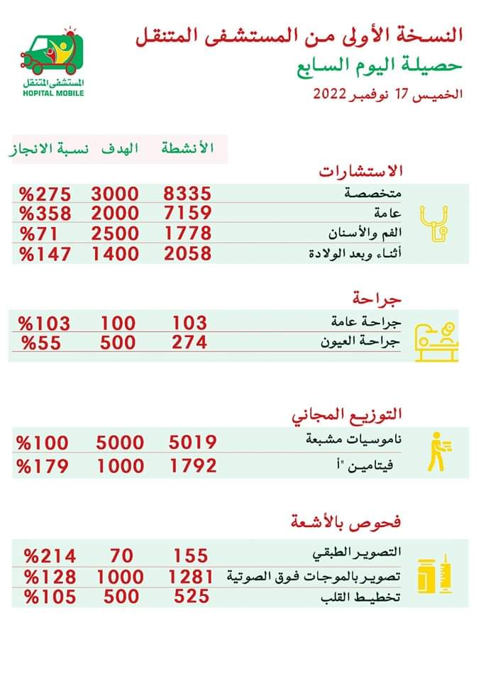 حصيلة النسخة الأولى من المستشفى المتنقل حصيلة اليوم السابع الخميس 17 نوفمبر 2022 * الاستشارات -المتخصصة 8335 أي نسبة 275% من الهدف المرسوم -العامة 7159 أي نسبة 358% من الهدف المرسوم -الفم والأسنان 1778 أي نسبة 71% من الهدف المرسوم -أثناء وبعد الولادة 2058 أي نسبة 147% من الهدف المرسوم * الجراحة -جراحة عامة 103 أي نسبة %103 من الهدف المرسوم -جراحة العيون 274 أي نسبة 55% من الهدف المرسوم *التوزيع المجاني -ناموسيات مشبعة 5019 نسبة 100% من الهدف المرسوم -فيتامين أ ومكافحة الطفيليات لدى الأطفال 1792 أي نسبة 179% من الهدف *فحوص بالأشعة -التصوير الطبقي 155 أي نسبة 214% من الهدف المرسوم -التصوير بالموجات فوق الصوتية 1281 أي نسبة 128% من الهدف المرسوم -تخطيط القلب 525 أي نسبة 105% من الهدف المرسوم