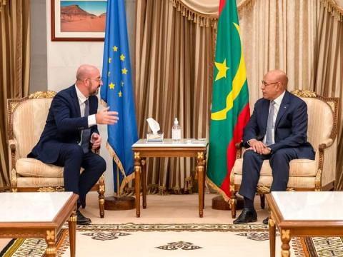 (الإعلام نت): استقبل رئيس الجمهورية محمد ولد الشيخ الغزواني مساء اليوم بالقصر الرئاسي رئيس المجلس الأوروبي شارل ميشل الذي بدأ اليوم زيارة لموريتانيا تستمر ليومين.