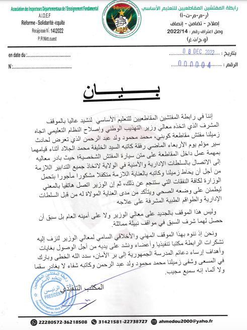 (الإعلام نت): قالت رابطة المفتشين المقاطعيين للتعليم الأساسي إن وزارة التهذيب الوطني وإصلاح النظام التعليمي تكفلت "بعلاج مفتش مقاطعة كوبني محمد محمود ولد عبد الرحمن وكاتبه بعد تعرضهما لحادث سير يوم الأربعاء الماضي".