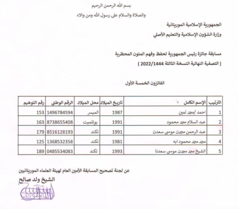 (الإعلام نت): أعلنت وزارة الشؤون الإسلامية والتعليم الأصلي اليوم أسماء الفائزين الخمسة الأوائل في التصفية النهائية للنسخة الثانية من "مسابقة رئيس الجمهورية لحفظ وفهم المتون المحظرية".
