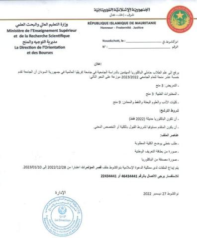 يتم إيداع الملفات لدى ممثلية الدعوة الإسلامية بنواكشوط خلف قصر المؤتمرات اعتبارا من 28/12/2022 إلى 10/01/2023.