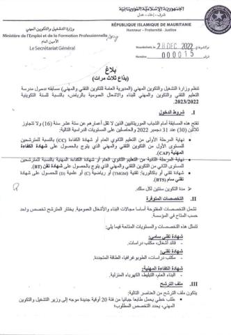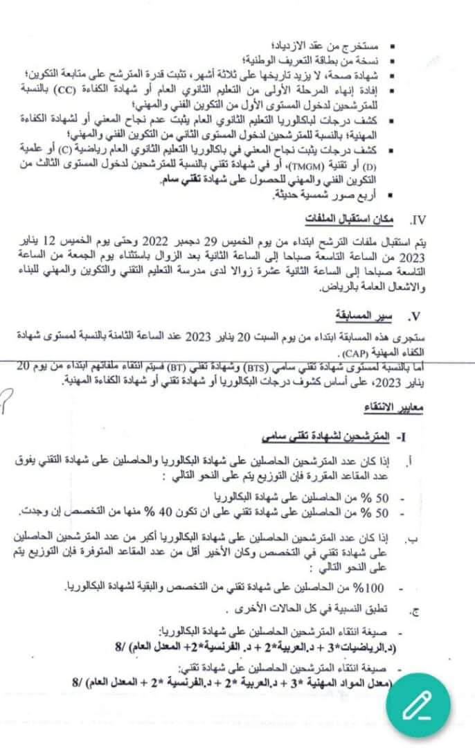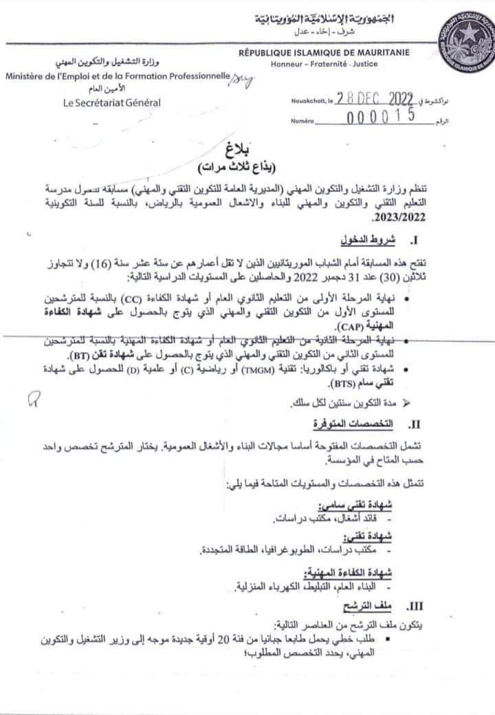 (الإعلام نت): "تعلن وزارة التشغيل و التكوين المهني(المديرية العامة للتكوين المهني) عن تنظيم مسابقة لدخول مدرسة التعليم الفني و التكوين المهني للبناء و الأشغال العامة بمقاطعة الرياض ، بالنسبة للسنة التكوينية 2023-2022"