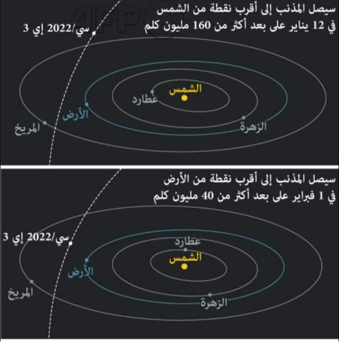 مرور المذنب "سي 2022 إي 3" تعد المرة الأولى منذ 50 ألف سنة فيما سيصل إلى أقرب نقطة من الأرض بحوالي 40 مليون كلم فاتح فبراير القادم وفق التوقعات.