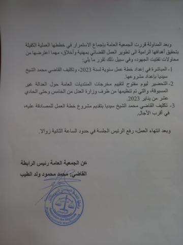 كما قررت المباشرة في انشاء خطة عمل سنوية للعام 2023 مع تكليف القاضي محمد ولد الشيخ سيديا بإعداد مشروعها وحسب المحضر فقد قررت الجمعية من بين امور أخرى مايلي: