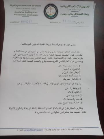جاء ذلك في محضر اجتماع جمعيتها العمومية المنعقدة اليوم بمقرها المركزي بقصر العدل بنواكشوط تحت رئاسة القاضي/محمدمحمود ولد الطيب وارسلت نسخة منه لشبكة المراقب ..