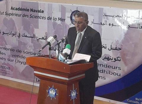 اشرف الأمين العام لوزارة الصيد والاقتصاد البحرى محمد المصطفى الملقب إدومو ولد عبدي ولد اجيد، اليوم الأربعاء بمباني الاكاديمية البحرية في نواذيبو، على حفل تخرج الدفعة الثانية من بائعي الأسماك.