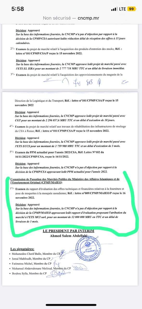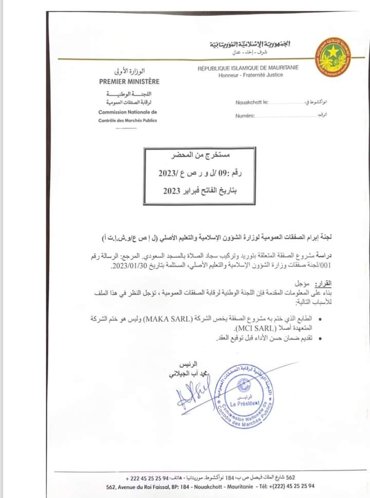 أولا: اللجنة لم تلغِ الصفقة ولم تتحدث عن عدم موافقتها على الصفقة، حيث قامت الوزارة بالإجراءات الإدارية العادية وذلك بإحالة الملف للجنة الصفقات المعنية بالقطاع والتي قامت بالإجراءات المطلوبة وأحالت الملف إلى لجنة رقابة الصفقات العمومية، والتى بدورها صادقت على الصفقة (انظر رسالة اللجنة حول الموافقة) وحينها تم منح الاقتناء لمؤسسة ( MCI SARL)