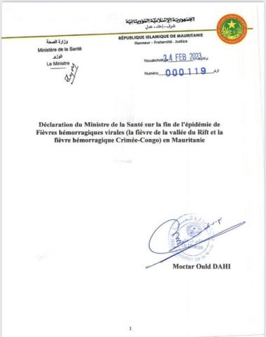 (الإعلام نت): أصدر وزير الصحة المختار ولد داهي، تصريحا رسميا موجها للشركاء في مجال الصحة أعلن فيه خلو موريتانيا، من الحمى النزيفية (الوادي المتصدع والقرم الكونغولية).
