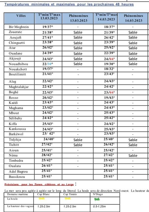 وستشهد مدينة نواكشوط، رياحا ضعيفة الى معتدلة شمالية شرقية الى شمالية غربية مصحوبة بانخفاض طفيف في درجات الحرارة ابتدا ًء من يوم الثلاثاء
