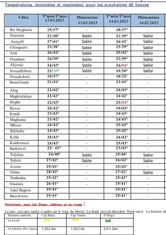 وذكرت أن الرياح مستكون عتدلة إلى قوية شمالية شرقية إلى شرقية على نشيري و داخلت انواذيبو و تكانت وآدرار وتيرس زمور والحوض الشرقي، ما سيؤدي الى رؤية متأثرة الى محدودة بفعل الأتربة على هذه المناطق.