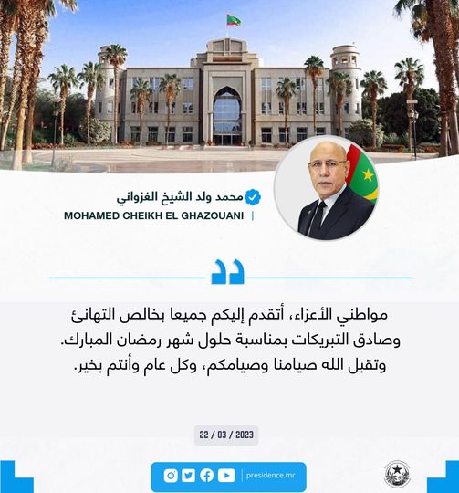 (وكالة الإعلام الإخبارية): هنأ الرئيس الموريتاني محمد ولد الشيخ الغزواني الموريتانيين، بمناسبة حلول شهر رمضان الكريم.