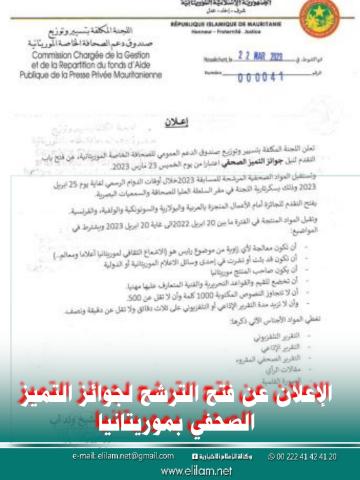 (وكالة الإعلام الإخبارية): أعلنت اللجنة المكلفة بتسيير وتوزيع صندوق الدعم العمومي للصحافة الخاصة الموريتانية فتح باب التقدم لنيل جوائز التميز الصحفي.