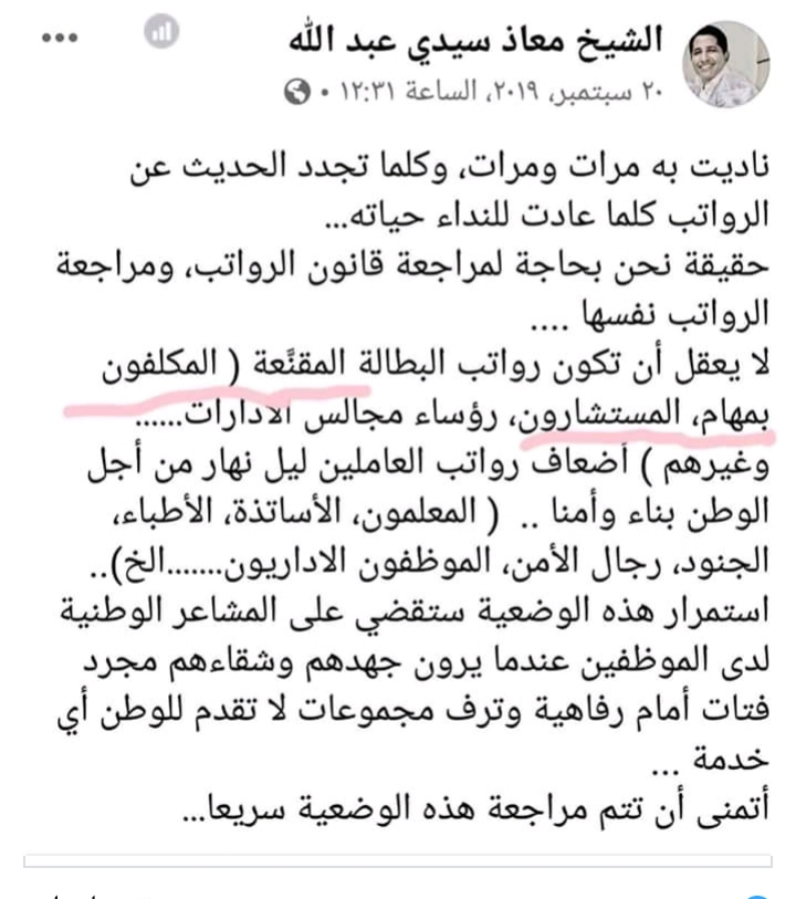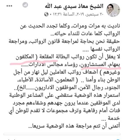 اعاد مدونون ونشطاء على مواقع التواصل الاجتماعي نشر تدوينة سابقة لمكلف بمهمة جديد عين أمس خلال اجتماع مجلس الوزراء ينتقد فيها رواتب المكلفين بالمهام والمستشارين.