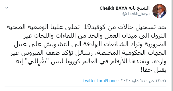 وأوضح في تغريدة له على تويتر إنه ينبغي التخلي عن الرسائل التي تشوش على عمل الجهات الحكومية المختصة، رسائل تؤكد ضعف الفيروس غير وارده، وتفندها الأرقام في العالم كورونا ليس "بِقْرِللي" إنه يقتل حقا!