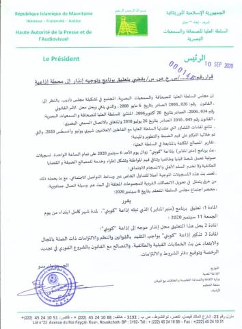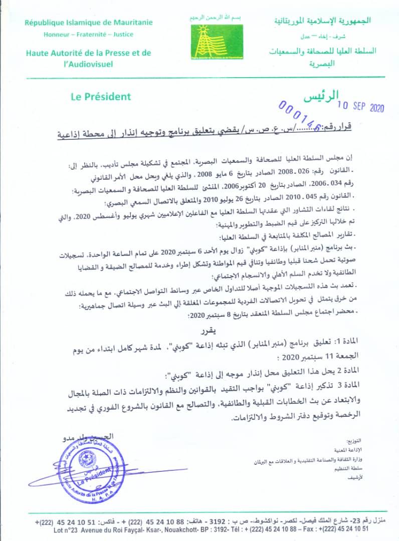 اتخذت السلطة العليا للصحافة والسمعيات البصرية "الهابا" قرارا يقضي بتعليق برنامج "منبر المنابر" الذي يبث عبر أثير إذاعة "كوبني" لمدة شهر كامل.