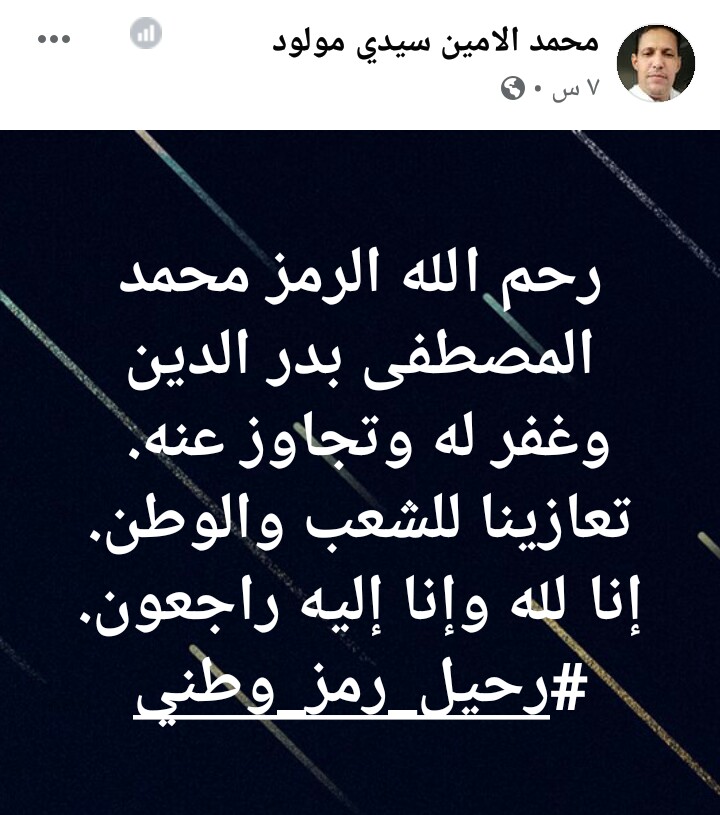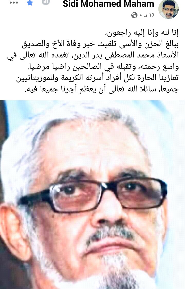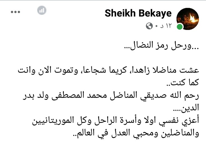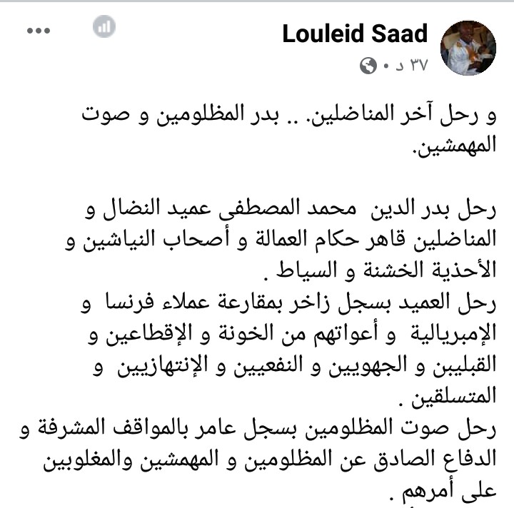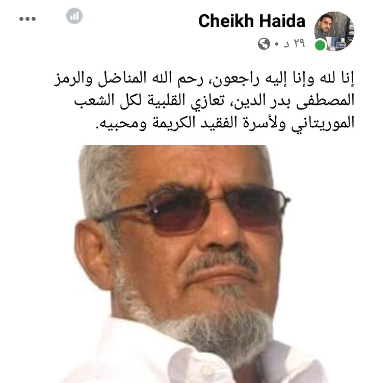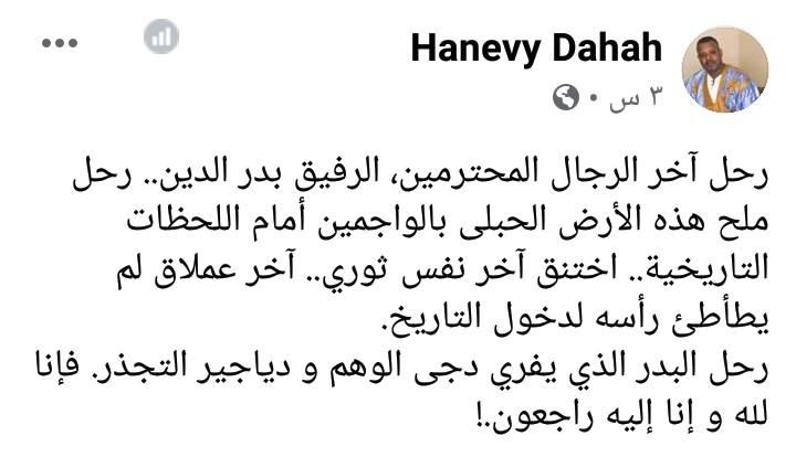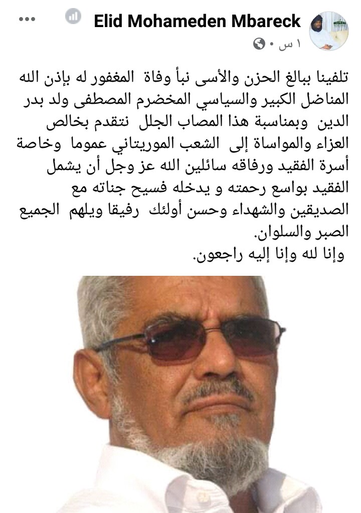 الإعلام نت - لم يكن إعلان رحيل القيادي السياسي محمد المصطفى ولد بدر الدين بالحدث الذي يمر مرور الكرام على صفحات السوشل ميديا فقد ضجت الصفحات المحلية بنعي الرجل الذي عاصر كل الأنظمة الموريتانية وناضل من أجل تجسيد العدالة وإنصاف المظلومين والمهمشين.