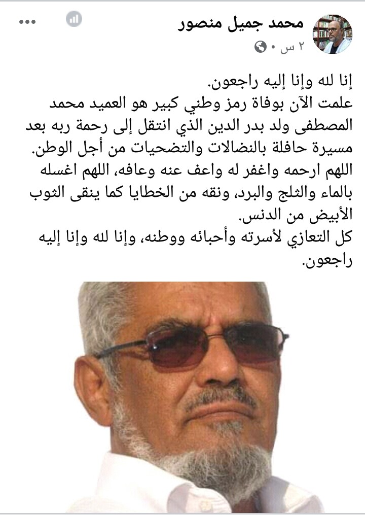 أما الرئيس السابق لحزب التجمع الوطني للإصلاح والتنمية تواصل محمد جميل منصور فقد نعى القيادي الراحل ووصفه بالرمز الكبير الذي رحل بعد عمر حافل بالتضحيات من أجل الوطن.