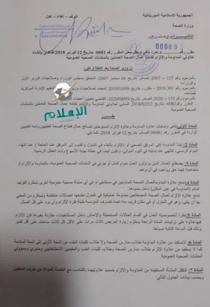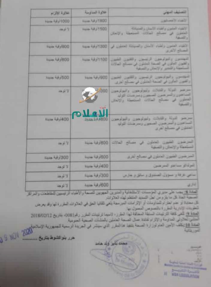 وفي سياق ذي صلة وصفت نقابة الأطباء الأخصائيين الموريتانيين المقرر الذي يخص علاوات المداومة عبرت بأنه قرار أحادي الجانب.ونددت النقابة بما قالت إنه اقصاء تعرضت له مطالبة الوزارة ومن خلالها الحكومة بالإلتزام بوعودها المتمثلة في البروتوكول الخاص بزيادة الرواتب ومراجعة علاوات المداومة بالنسبة للأخصائيين.