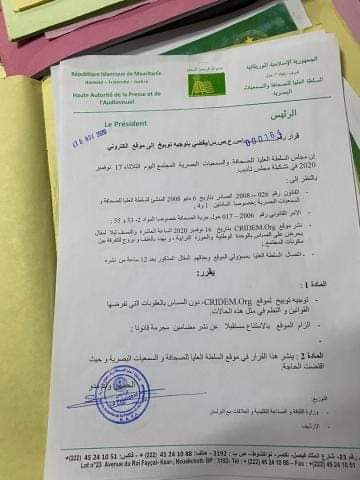 الإعلام نت - بعثت السلطة العليا للصحافة والسمعيات البصرية بموريتانيا بمذكرة توبيخ إلى موقع "كريدم" الالكتروني، وذلك على خلفية مقال اعتبرته يحرض على المساس بالوحدة الوطنية.