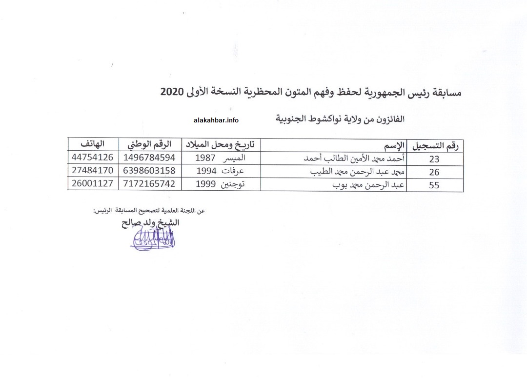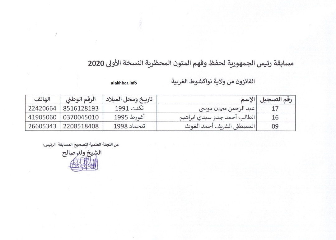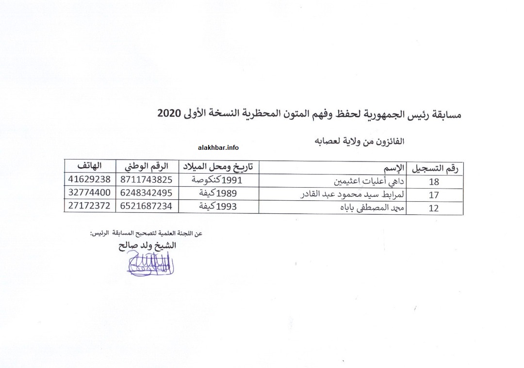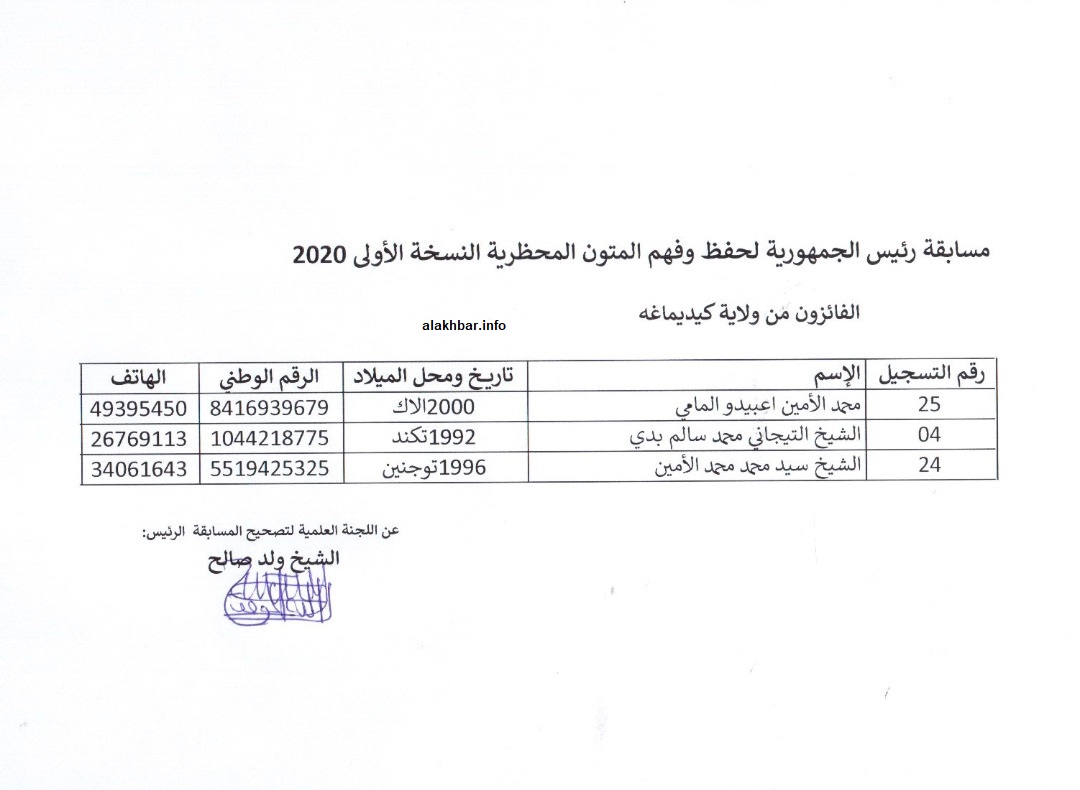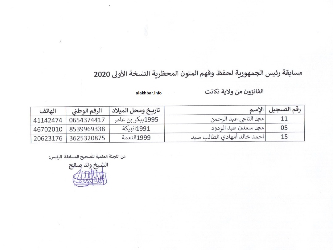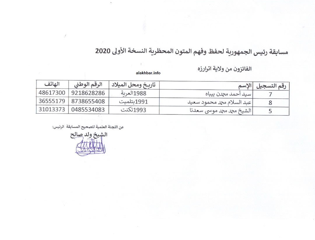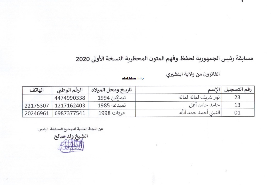 الإعلام نت - كشفت وزارة الشؤون الإسلامية والتعليم الأصلي اليوم الخميس عن أسماء الفائزين في الدور الأول من مسابقة حفظ وفهم المتون المحظرية، التي تضم 45 شخصا، وتمثل فيها كل ولاية بـ3 مقاعد.