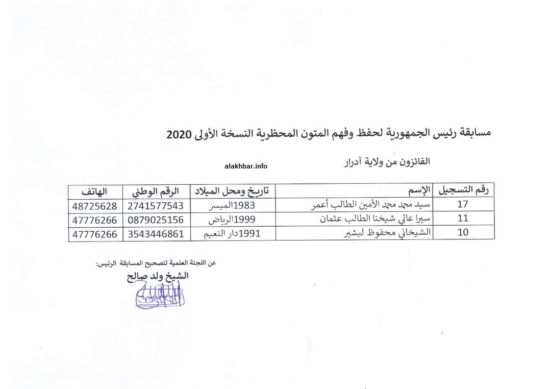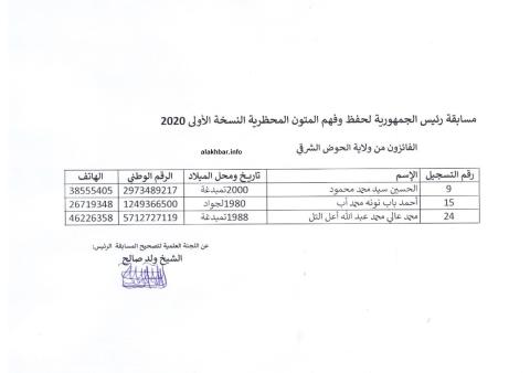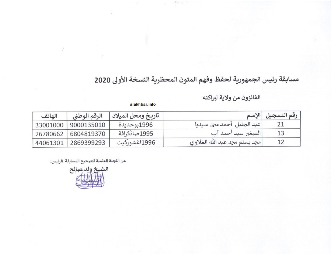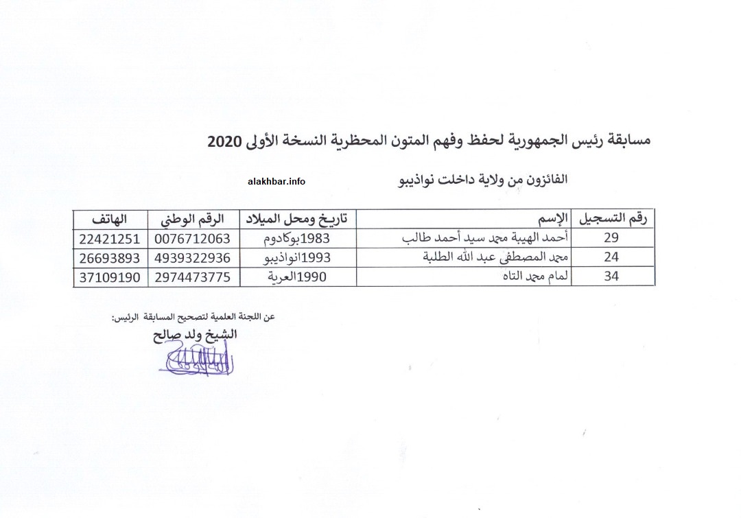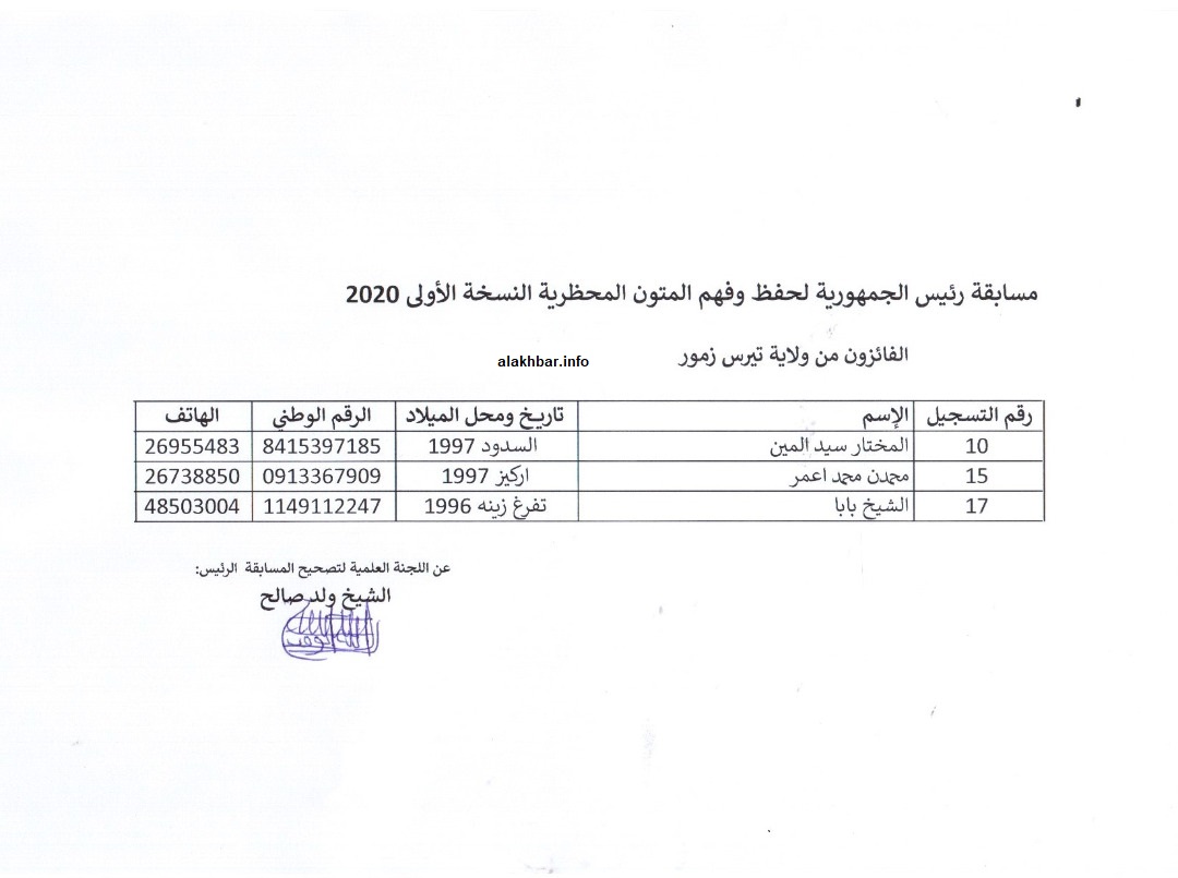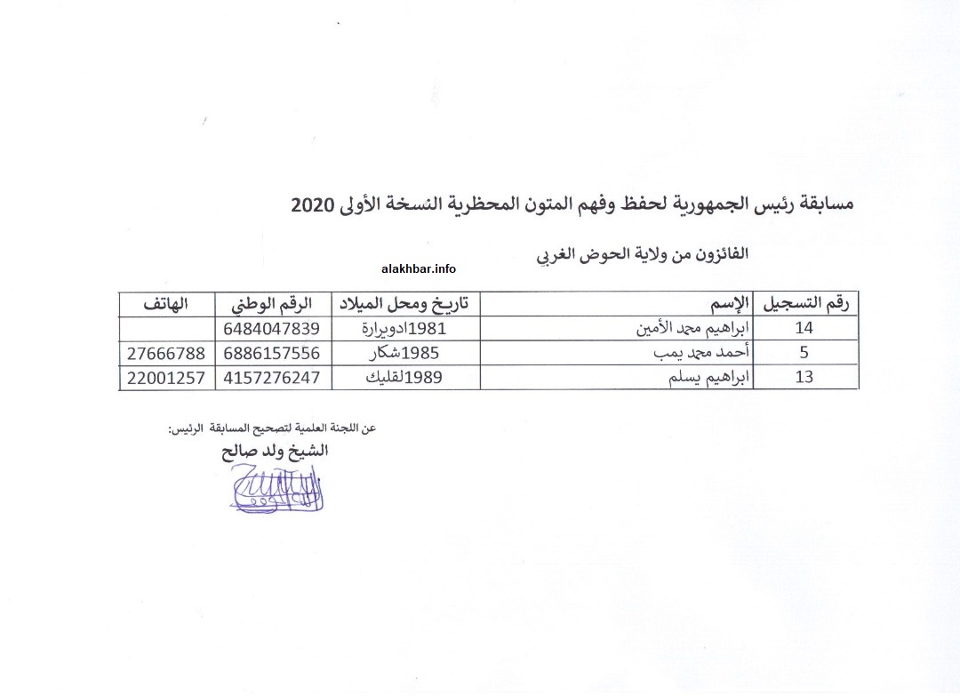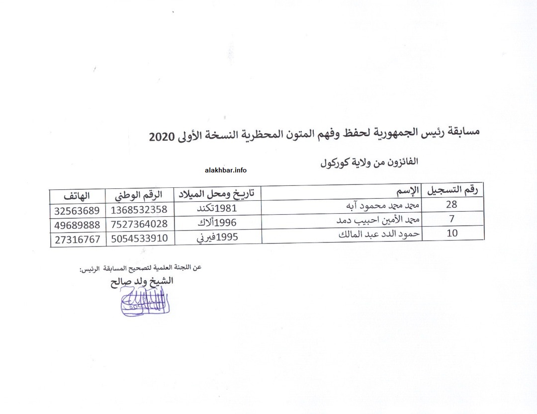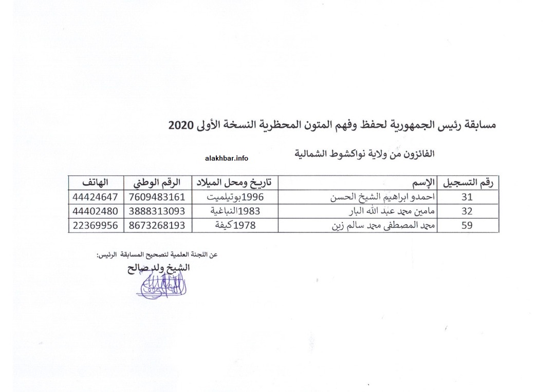 الإعلام نت - كشفت وزارة الشؤون الإسلامية والتعليم الأصلي اليوم الخميس عن أسماء الفائزين في الدور الأول من مسابقة حفظ وفهم المتون المحظرية، التي تضم 45 شخصا، وتمثل فيها كل ولاية بـ3 مقاعد.