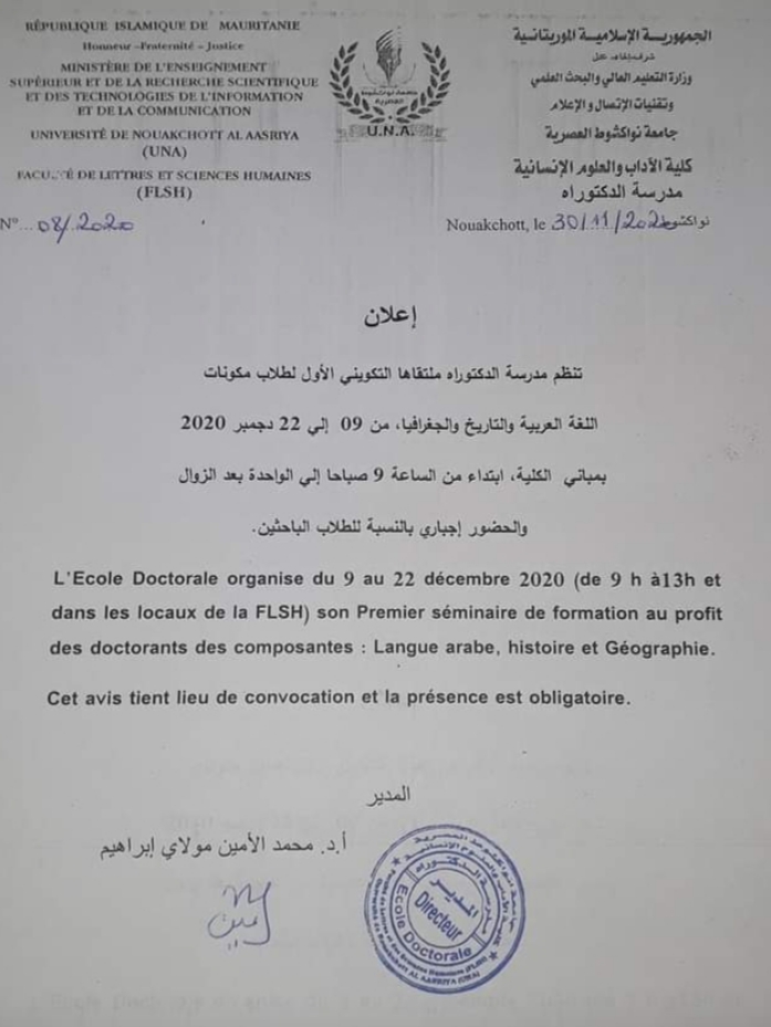 الإعلام نت - أعلنت مدرسة الدكتوراه بكلية الآداب والعلوم الإنسانية بجامعة نواكشوط عن تنظيم ملتقاها التكويني الأول لطلاب مكونات اللغة العربية والتاريخ والجغرافيا.