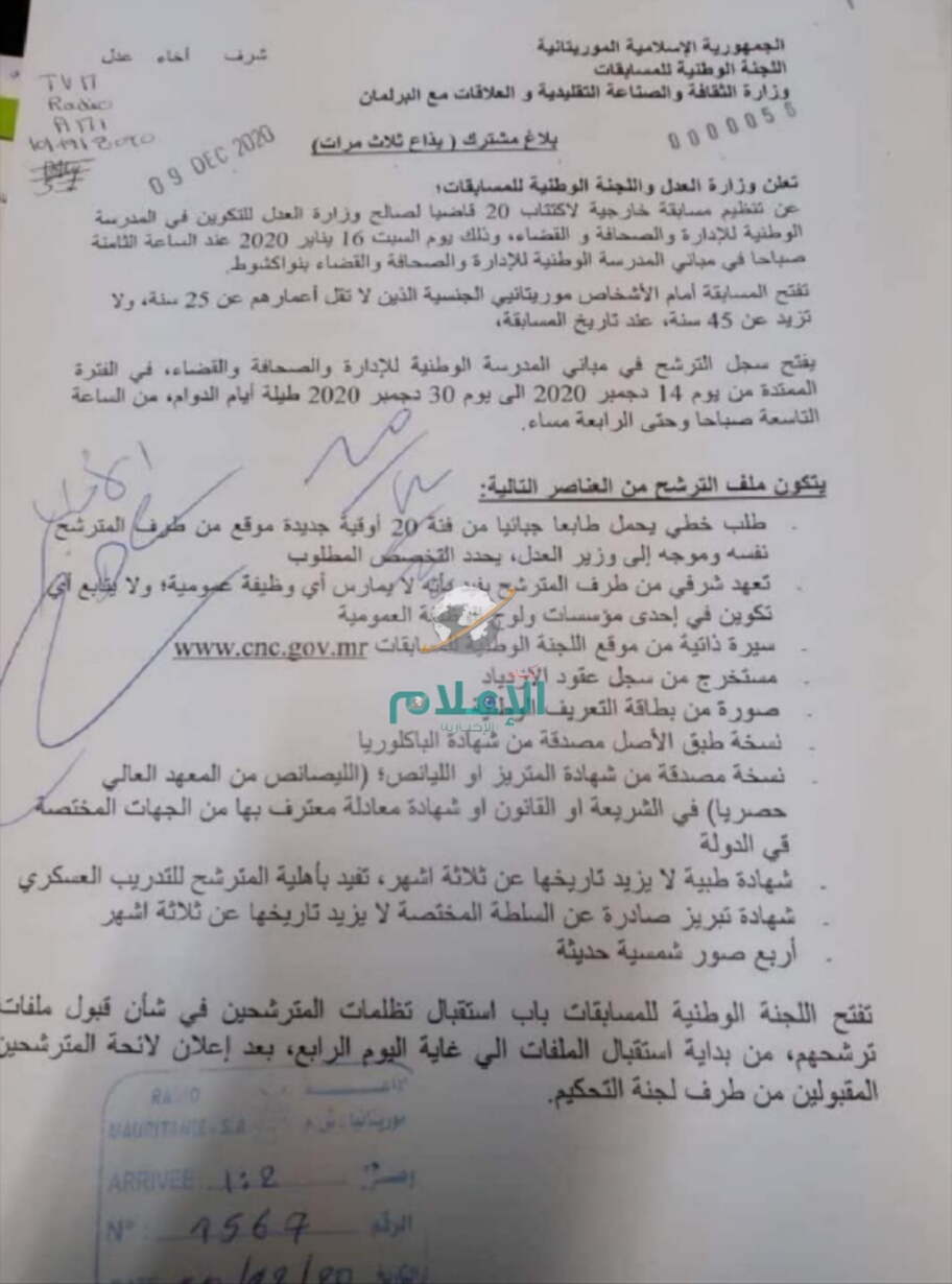 كنا أعلنتا انه تفتح المسابقة أمام الأشخاص موريتانيي الجنسية الذين لا تقل أعمارهم عن 25 سنة ولا تزيد على 45 سنة وأعلنت أن استقبال الملفات سيبدأ من يوم 14 دجمبر وينتهي يوم 30 دجمبر وسيتم استقبال الملفات في مباني المدرسة الوطنية للإدارة، على ان تنظم المسابقة يوم السبت 16 يناير 2021 في مباني المدرسة الوطنية للإدارة والصحافة والقضاء.