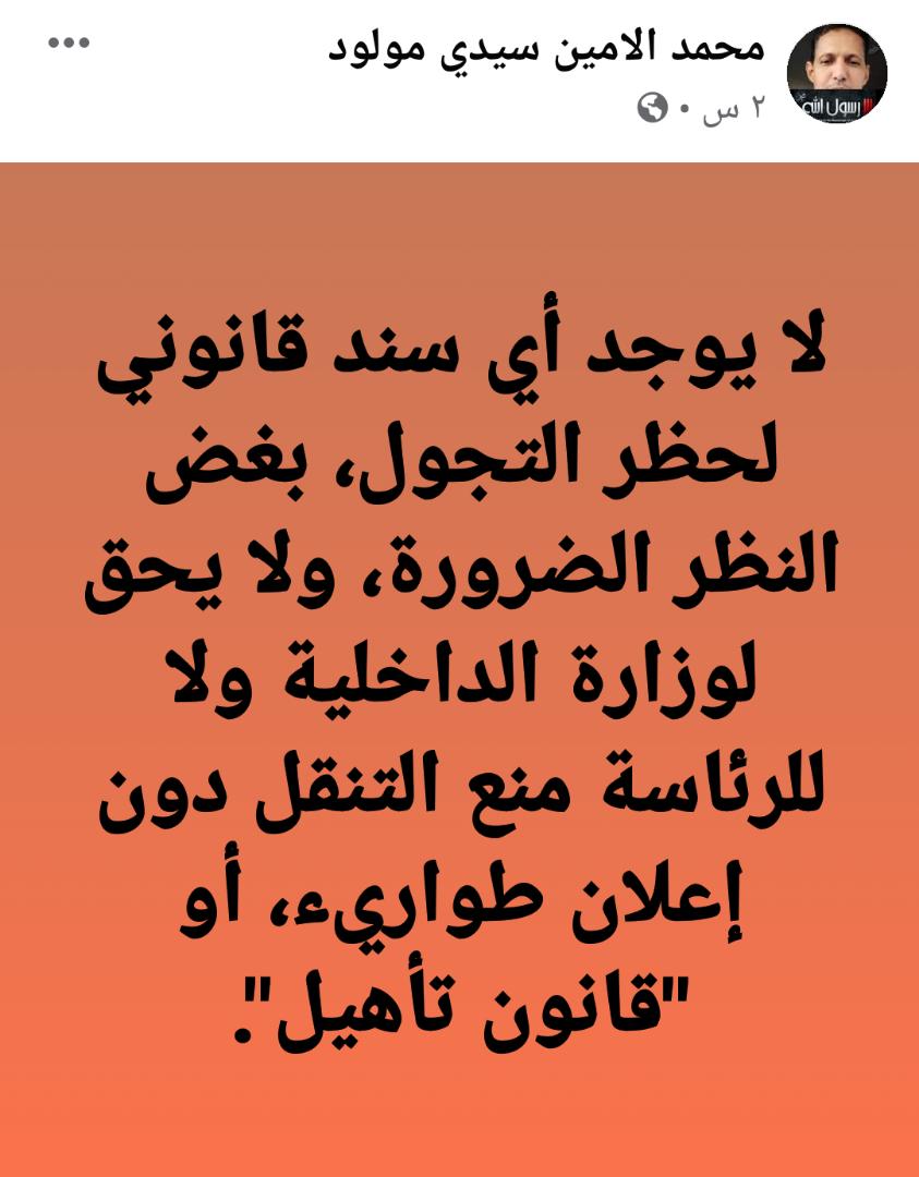 وأضاف ولد سيدي مولود في تصريح لموقع الأخبار الإعلان الصادر اليوم غير قانوني، لأن الدستور صريح في مادته العاشرة بأنه "لا تقيد الحرية إلا بالقانون"، وما أعلن اليوم ليس قانونا، وإنما مجرد بيان من الداخلية، وآخر من الرئاسة.