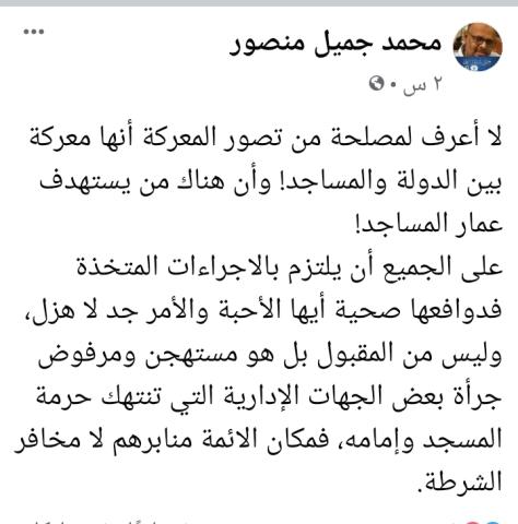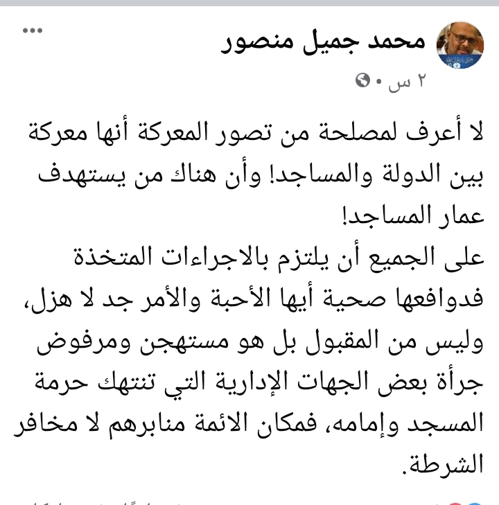 على الجميع أن يلتزم بالاجراءات المتخذة فدوافعها صحية أيها الأحبة والأمر جد لا هزل، وليس من المقبول بل هو مستهجن ومرفوض جرأة بعض الجهات الإدارية التي تنتهك حرمة المسجد وإمامه، فمكان الائمة منابرهم لا مخافر الشرطة.