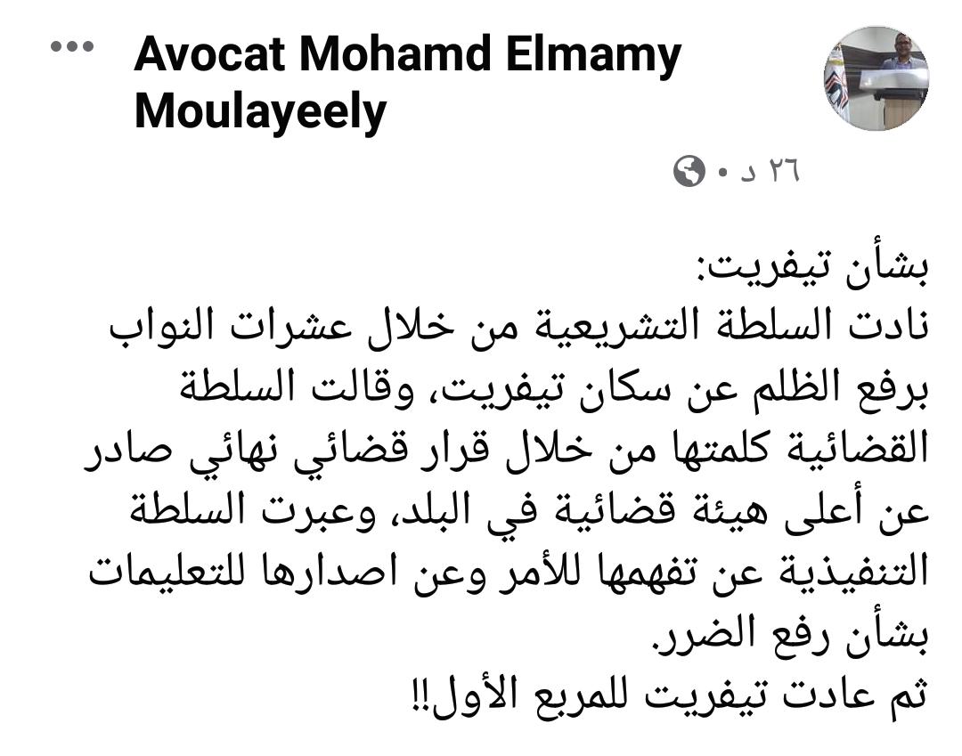 نادت السلطة التشريعية من خلال عشرات النواب برفع الظلم عن سكان تيفريت، وقالت السلطة القضائية كلمتها من خلال قرار قضائي نهائي صادر عن أعلى هيئة قضائية في البلد، وعبرت السلطة التنفيذية عن تفهمها للأمر وعن اصدارها للتعليمات بشأن رفع الضرر.