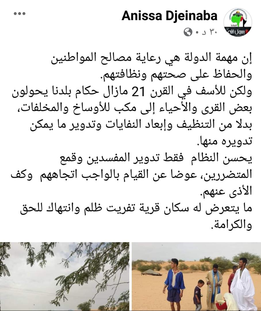تابعنا في حزب الخيار الوطني صباح اليوم ما أقدمت عليه قوات الأمن في قرية تفريت شرقي العاصمة من قمع و تنكيل بالنساء و الأطفال و المرضى و ذلك لأنهم رفضوا قبول عودة المكب الذي تم إبلاغهم رسميا بإغلاقه سابقا إننا في حزب الخيار الوطني إذ نأسف لمثل هذه التصرفات المشينة من طرف السلطات لنسجل ما يلي :