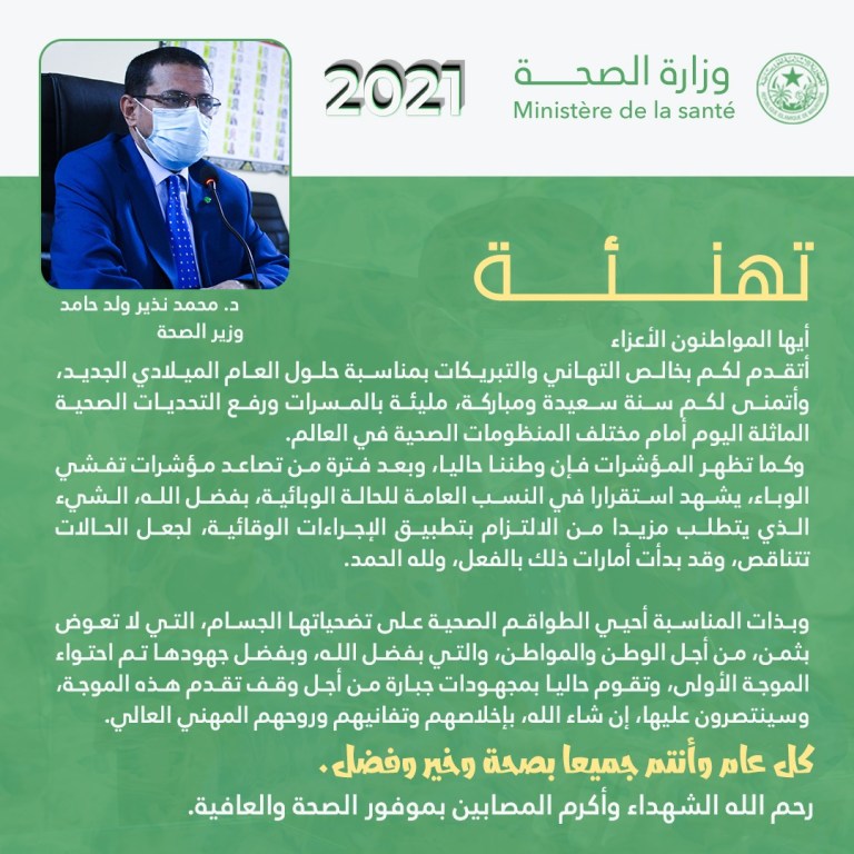 الإعلام نت _ هنأ وزير الصحة نذيرو ولد حامد كافة المواطنين بمناسبة حلول السنة الجديدة 2021، ودعى وزير الصحة إلى مزيد من الإلتزام بالإجراءات الصحية لتعبر بلادنا هذه الموجة من كوفيد.