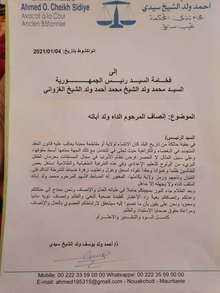 الإعلام - ناشد الأستاذ أحمد ولد يوسف ولد الشيخ سيديا الرئيس محمد ولد الشيخ الغزواني برد الاعتبار للراحل الداه ولد اباته.
