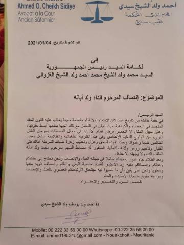 وقال ولد الشيخ سيديا في رسالة وجهها للرئيس (المرفق) إنه في إطار التجاوزات التي حصلت في فترات سابقة تمت ممارسة الحيف على ولد باته بدون وجه حق.