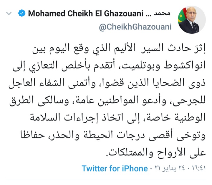 إثرَ حادث السير الأليم الذي وقع اليوم بين انواكشوط وبوتلميت، أتقدم بأخلص التعازي إلى ذوى الضحايا الذين قضوا، وأتمنى الشفاء العاجل للجرحى، وأدعو المواطنين عامة، وسالكى الطرق الوطنية خاصة، إلى اتخاذ إجراءات السلامة وتوخى أقصى درجات الحيطة والحذر، حفاظا على الأرواح والممتلكات.