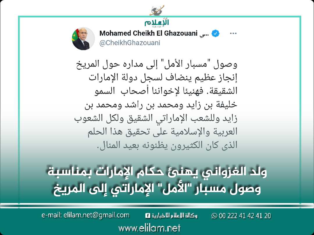 وقال ولد الغزويني في تغريدة له على صفحته على تويتر إن "وصول (مسبار الأمل) إلى مداره حول المريخ إنجاز عظيم ينضاف لسجل دولة الإمارات الشقيقة".