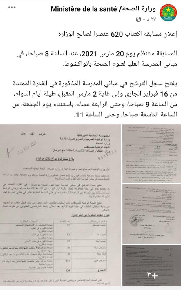 الإعلام نت ـ نشرت الصفحة الرسمية لوزارة الصحة الموريتانية على الفيس بوك إعلان تؤكد من خلاله عزمها اكتتاب 620 عنصرا لصالح الوزارة،