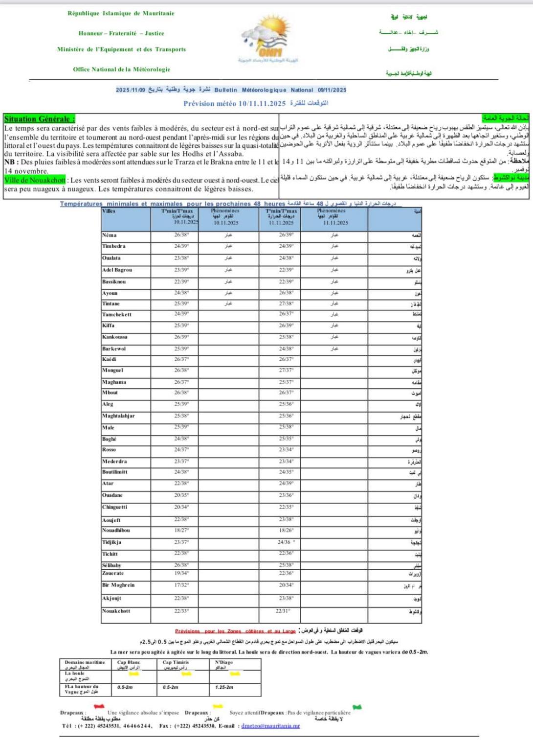 وفي نواكشوط، ستهب رياح ضعيفة إلى معتدلة شمالية شرقية إلى شمالية، مع رؤية متأثرة بالأتربة وسماء قليلة الغيوم.