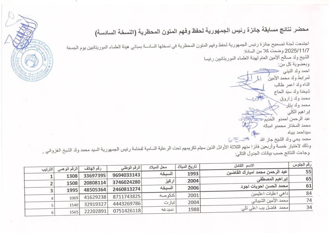 أعلنت وزارة الشؤون الإسلامية والتعليم الأصلي اليوم الثلاثاء أسماء الفائزين بمسابقة جائزة رئيس الجمهورية لحفظ وفهم المتون المحظرية في نسختها السادسة.