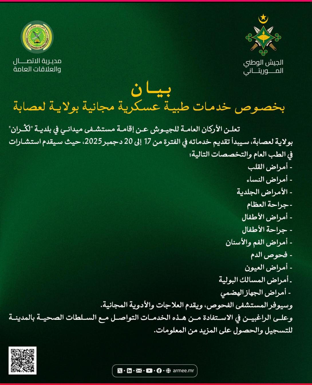 أعلن الجيش الوطني الموريتاني عن إقامة مستشفى ميداني في بلدية لكران بولاية العصابة مؤكدا أنه سيبدأ تقديم خدمات طبية في الفترة مابين 17 إلى 20 دجمبر الجاري.