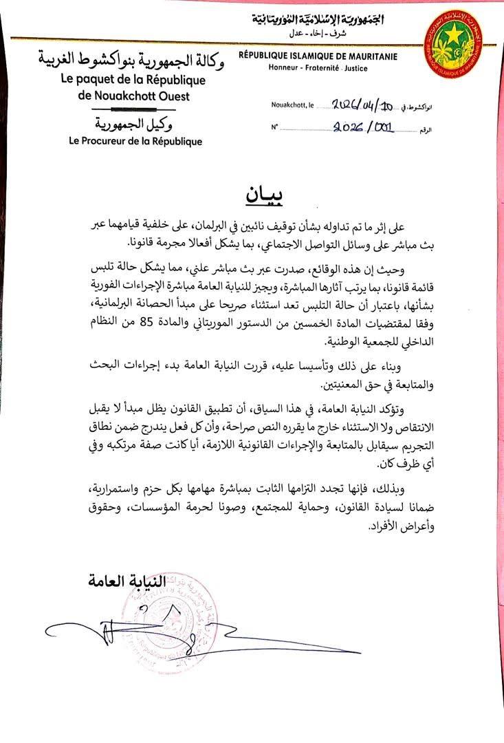 أعلنت النيابة العامة بولاية نواكشوط الغربية عن فتح إجراءات متابعة قضائية بحق نائبين في البرلمان، على خلفية محتوى تم تداوله عبر بث مباشر على منصات التواصل الاجتماعي، اعتبر أنه يتضمن أفعالًا يُشتبه في مخالفتها للقانون.